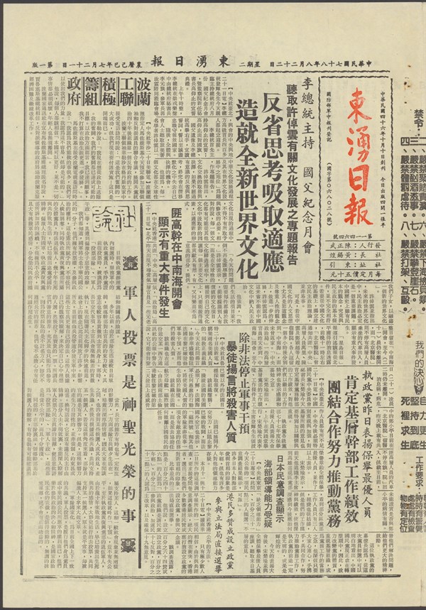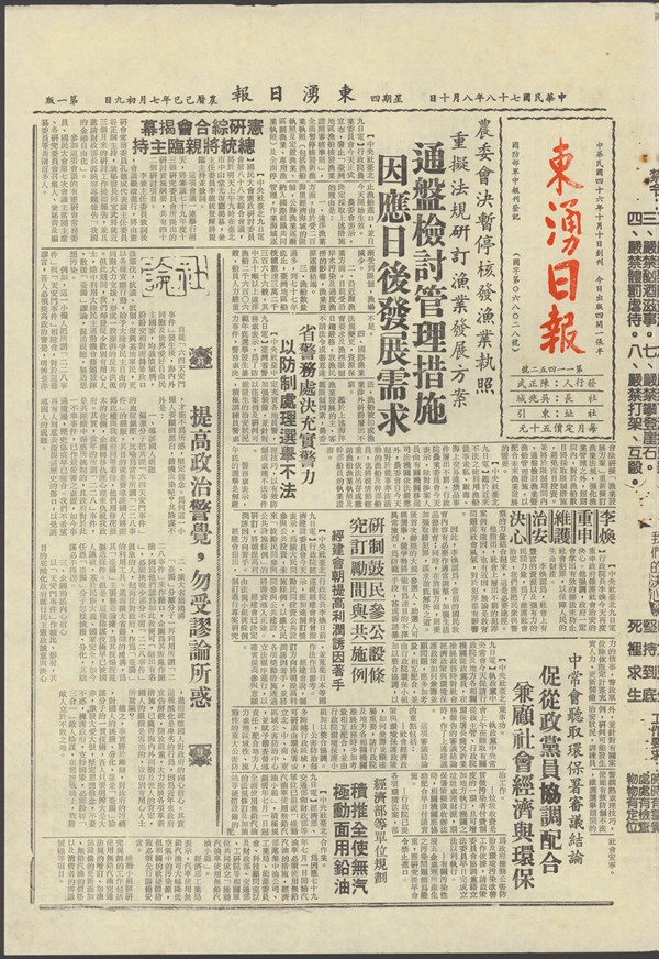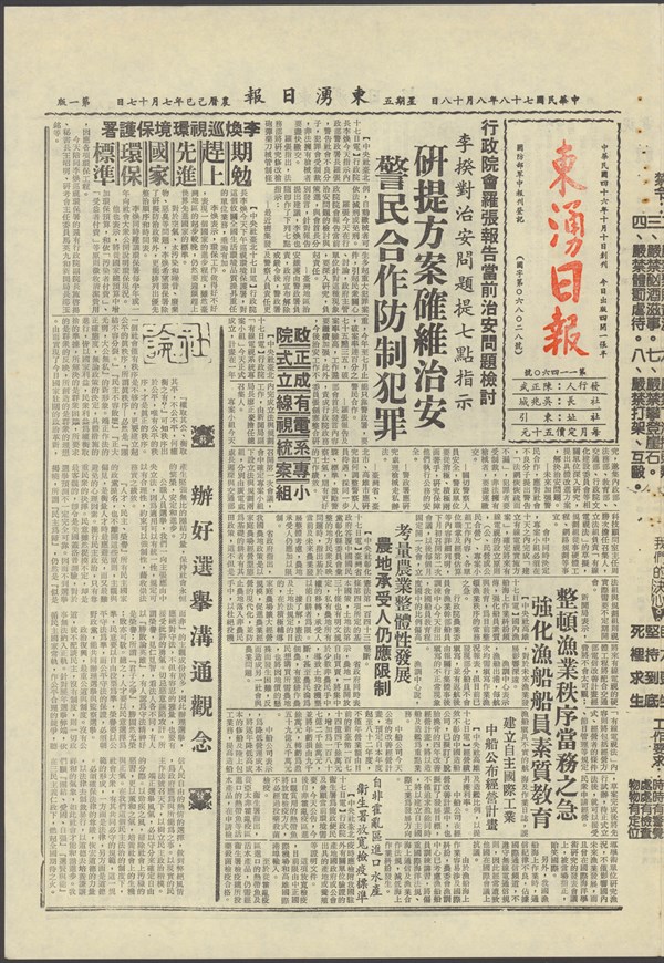 中華民國78年8月22日東湧日報第一一四六四期第一版 -