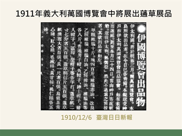 1910年臺灣日日新報_1911年義大利萬國博覽會中將展出蓪草展品 -