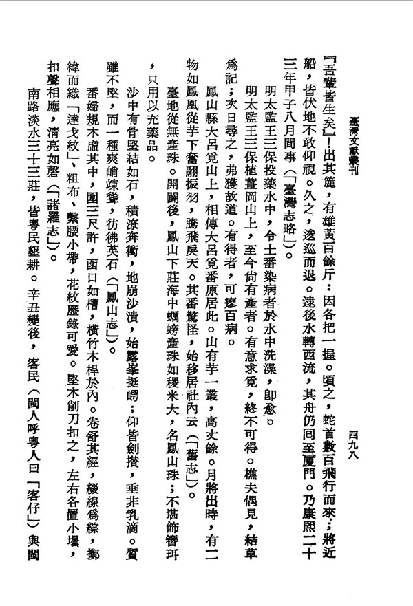 明太監王三保投入藥水中,令土番染病者於水中洗澡則痊癒 重修福建臺灣府志卷十九 台灣文獻史料叢刊 -