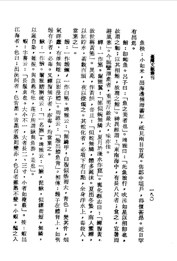 鰻無鱗甲,白腹似鱔而大,焚其骨烟氣辟蠹 恒春縣志卷九 台灣文獻史料叢刊 -