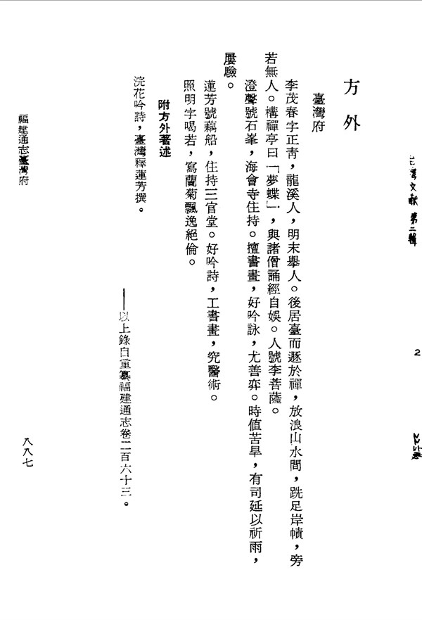 蓮芳為三官堂住持,亦探求醫術 福建通志臺灣府 台灣文獻史料叢刊 -