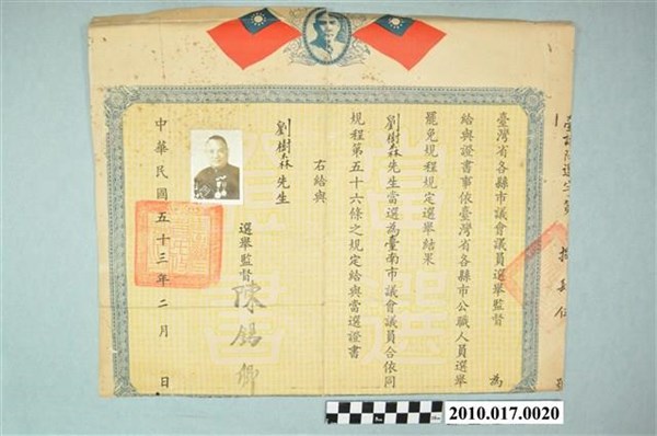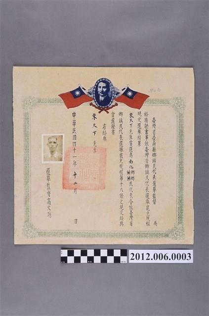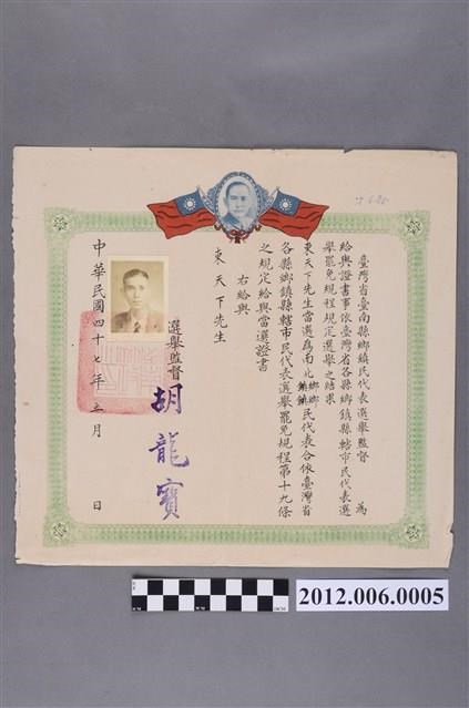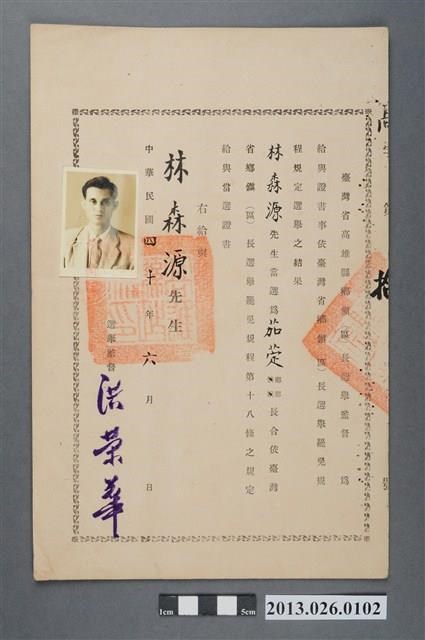 1950年5月26日高雄縣政府發給林森源當選茄萣鄉鄉長之選舉結果證書 -
