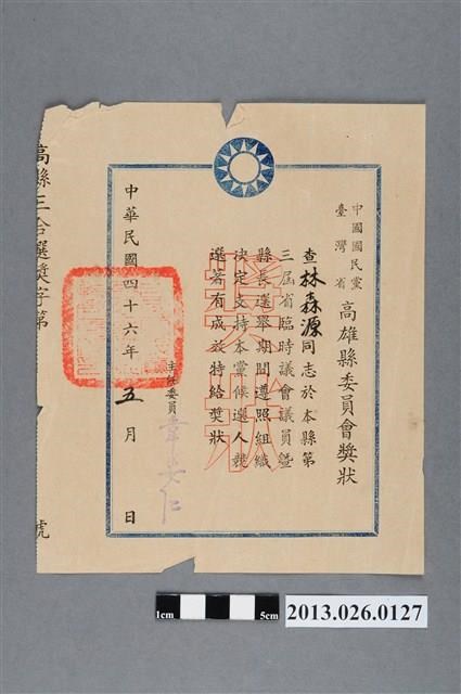 1957年5月中國國民黨台灣省高雄縣委員會頒發林森源選舉有功獎狀 -