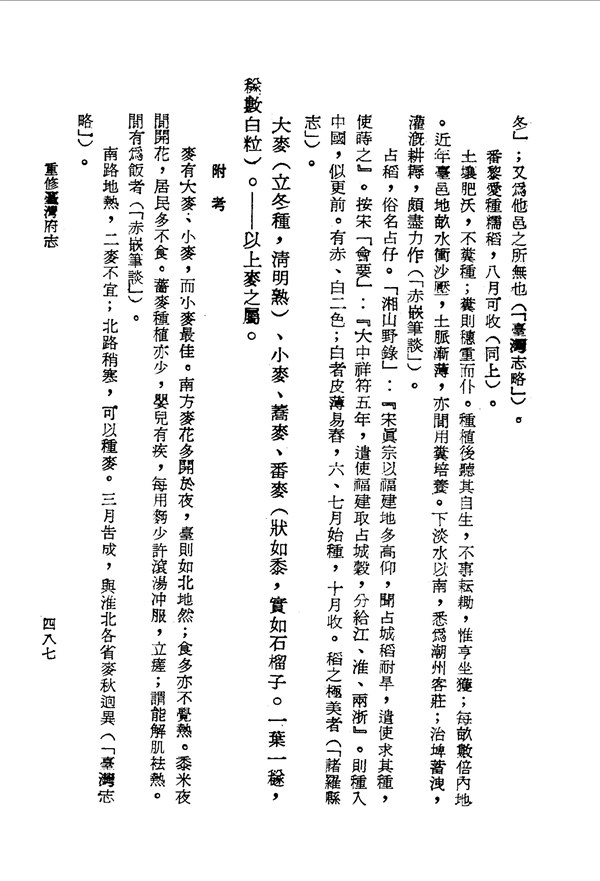 嬰兒有疾用麪少許滾湯沖服立癒,麥也能解肌袪熱 重修臺灣府志卷十七 台灣文獻史料叢刊 -