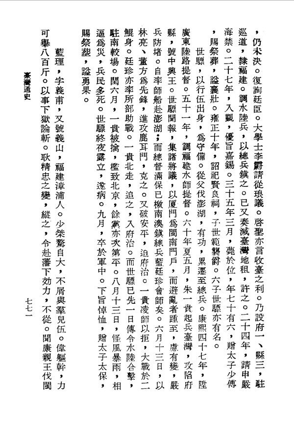 世驃整夜淋雨後病死 臺灣通史卷三十 台灣文獻史料叢刊 -