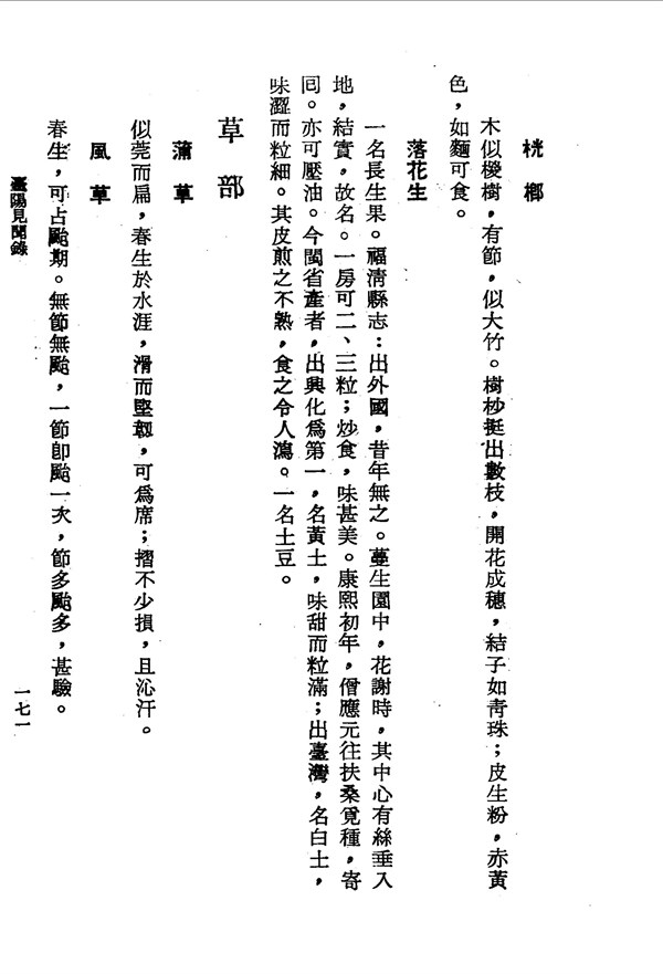 落花生出臺灣名白土,其皮煎之不熟,食之令人瀉 臺陽見聞錄卷下 台灣文獻史料叢刊 -
