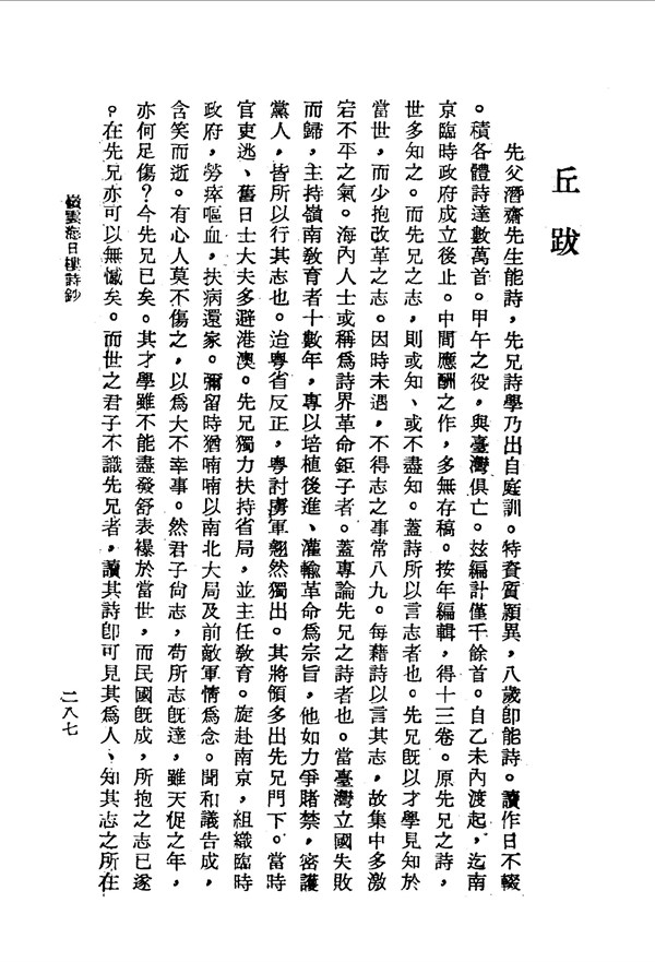 丘逢甲兄赴南京組織臨時政府,勞瘁嘔血,扶病還家 嶺雲海日樓詩鈔 台灣文獻史料叢刊