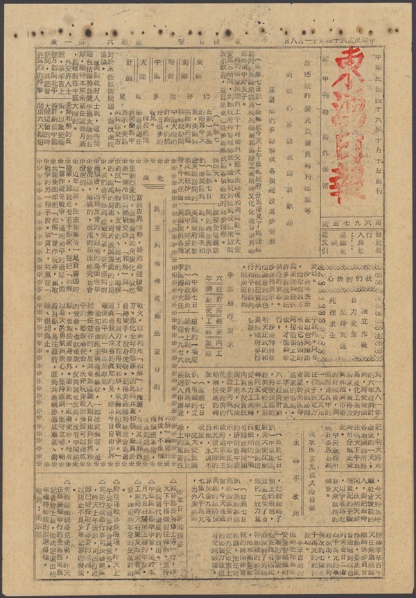 中華民國64年11月11日東湧日報第六九七七期第一版 -