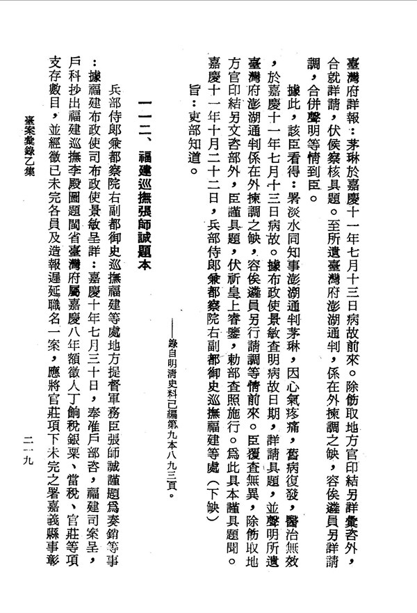 茅琳因心氣疼痛而死亡 臺案彙錄乙集卷三 台灣文獻史料叢刊 -