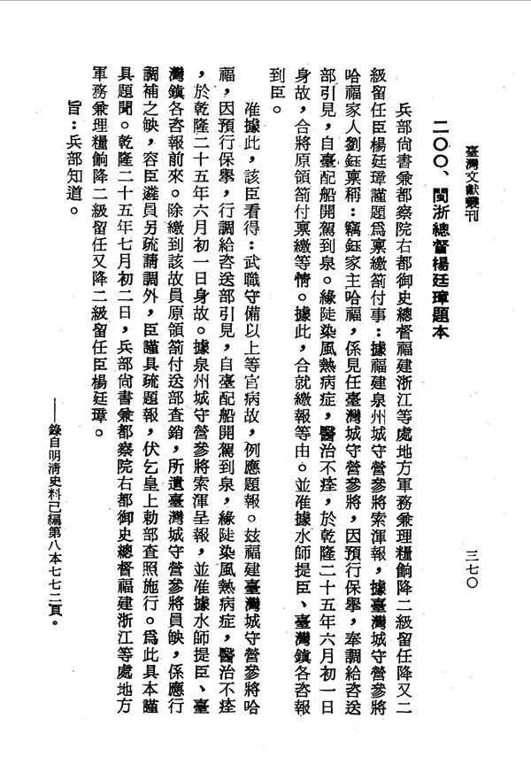 哈福感染風熱病而死亡 臺案彙錄乙集卷四 台灣文獻史料叢刊