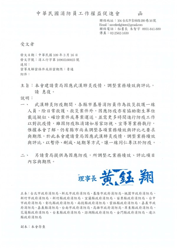 消防員工作權益促進會「讓基層專注防疫,調整業務績效評比」公函 -