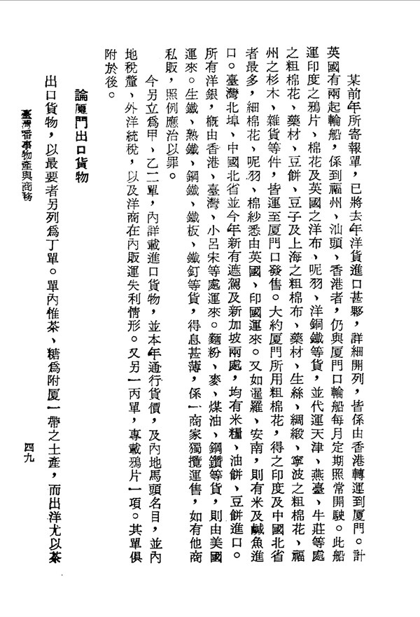 到臺貨物多由廈門運往 臺灣番事物產與商務 台灣文獻史料叢刊 -