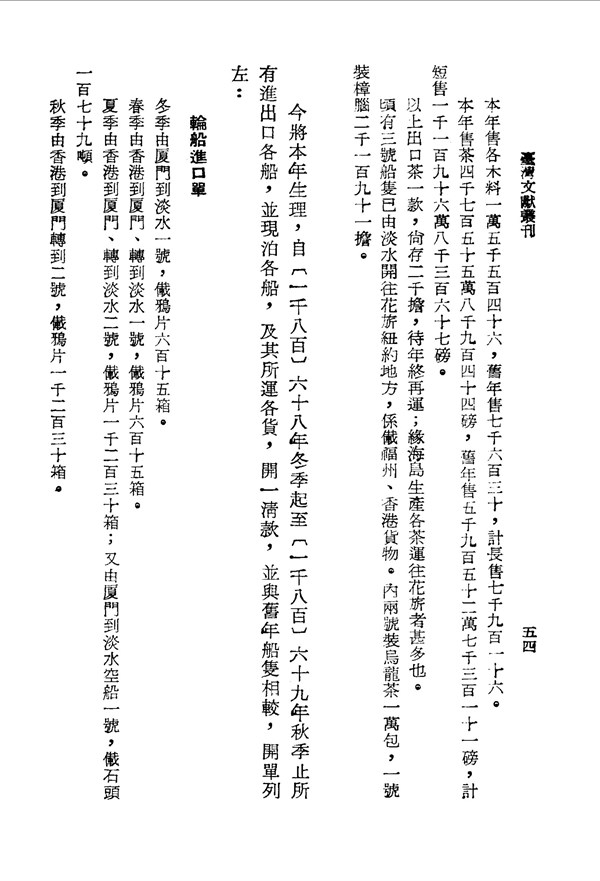 帆船夏季出口各貨物之數量 臺灣番事物產與商務 台灣文獻史料叢刊 -