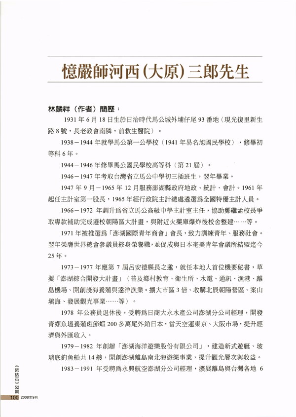 《硓古石》季刊第52期〈憶嚴師河西(大原)三郎先生〉 -