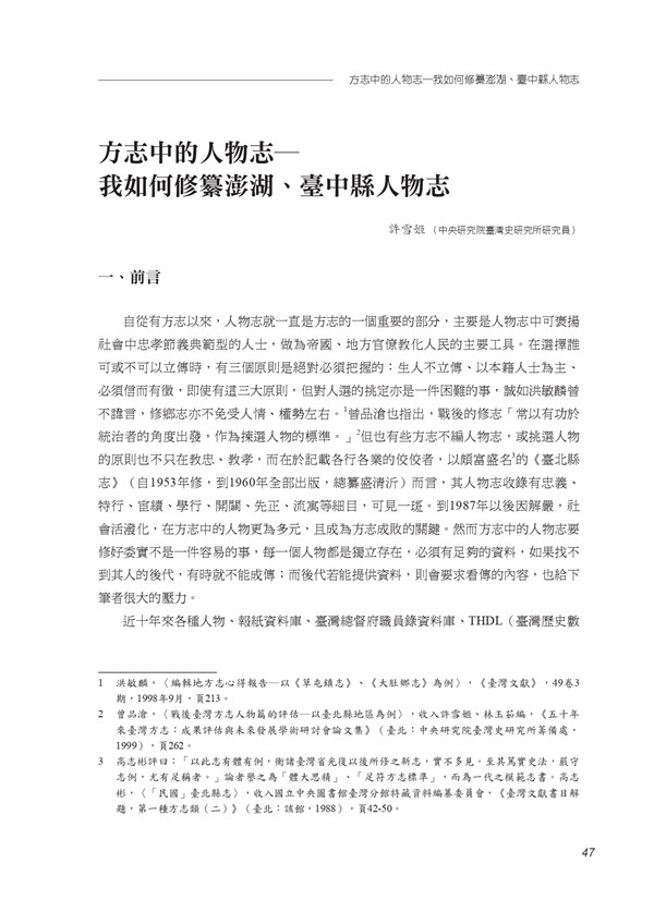 《澎湖研究學術研討會論文輯》第十二屆〈方志中的人物志—我如何修篡澎湖、台中縣人物志〉 -