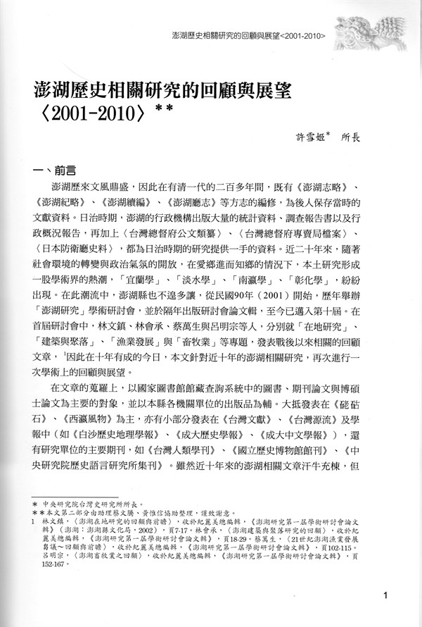 《澎湖研究學術研討會論文輯》第十屆〈澎湖歷史相關研究的回顧與展望(2001—2010)〉 -