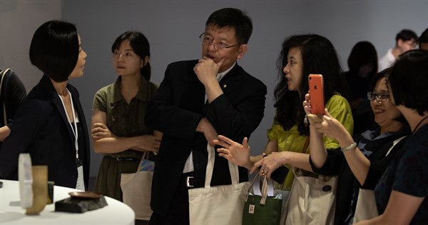 2019年4月24日台灣創意設計中心總顧問張光民與陳俊良設計師蒞臨臺灣文博會工藝館,茶3.1415展場參觀「器」區 -
