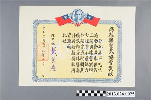 1959年高雄縣警民協會對林森源協助勸募第二期興建警察宿舍經費不遺餘力獎狀 -
