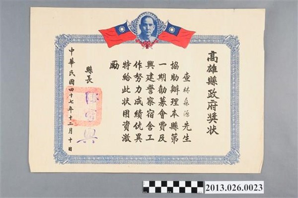 1958年林森源協助辦理高雄縣第一期勸募會費及興建警察宿舍工作努力獎狀 -