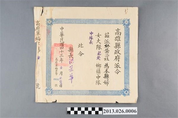 1954年高雄縣政府派林龔添根為高雄縣婦女大隊茄萣鄉中隊中隊長派令 -