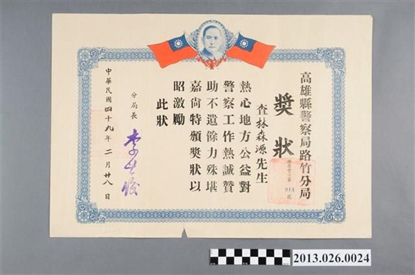 1960年高雄縣警察局路竹分局獎勵林森源熱心地方公益獎狀 -