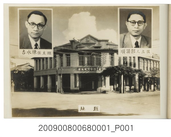 設立人郭頂順與班主任陳水吉之大頭照及臺中汽車協會外觀照 -