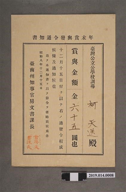 柯天送臺南州昭和8年12月15日年終獎金發放通知書 -