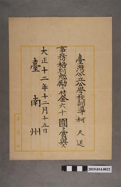 柯天送臺南州大正12年12月15日獎金發放通知書