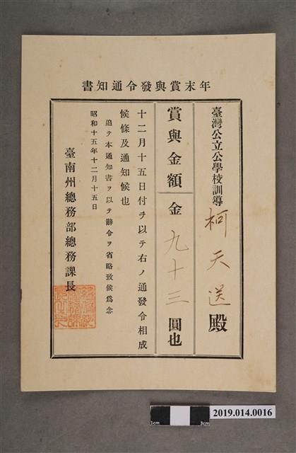 柯天送臺南州昭和15年12月15日年終獎金發放通知書 -