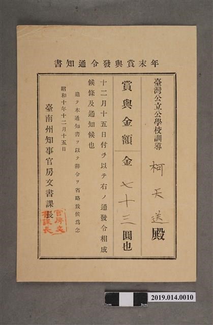 柯天送臺南州昭和10年12月15日年終獎金發放通知書 -