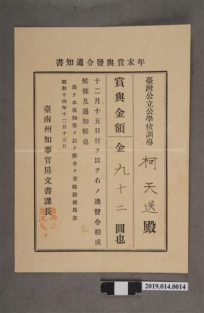 柯天送臺南州昭和14年12月15日年終獎金發放通知書 -