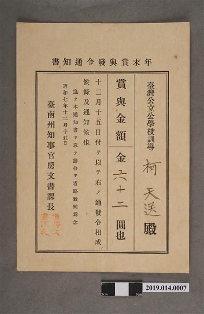 柯天送臺南州昭和7年12月15日年終獎金發放通知書 -