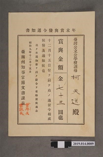 柯天送臺南州昭和9年12月15日年終獎金發放通知書 -
