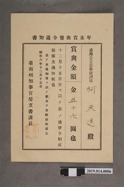 柯天送臺南州昭和6年12月15日年終獎金發放通知書 -