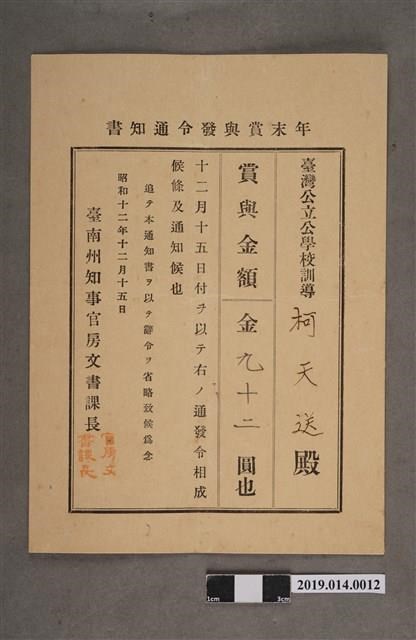 柯天送臺南州昭和12年12月15日年終獎金發放通知書 -