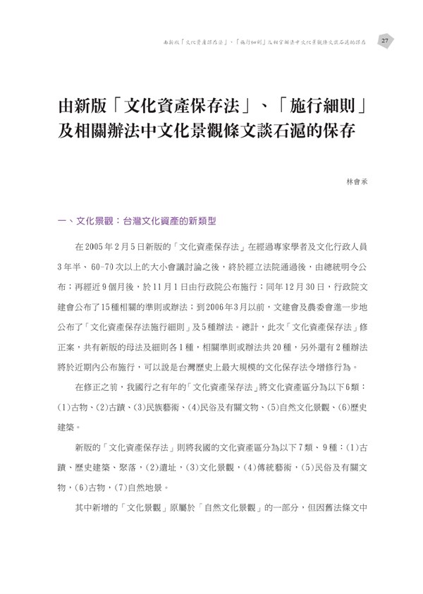 《澎湖研究學術研討會論文輯》第五屆〈由新版「文化資產保存法」、施行細則及相關辦法中文化景觀條文談石滬的保存〉 -