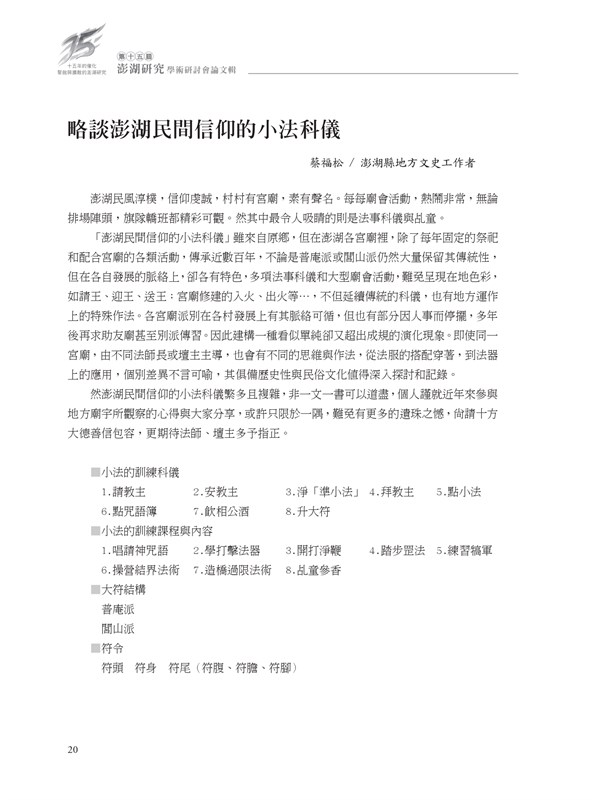 《澎湖研究學術研討會論文輯》第十五屆〈略談澎湖民間信仰的小法科儀〉 -