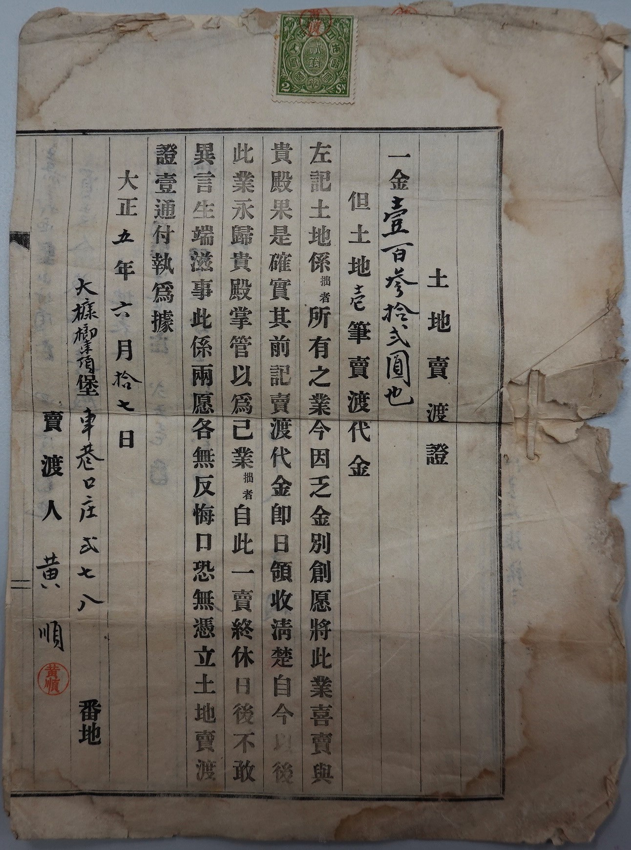 本件文物為為日治時期北港地區的土地賣渡證,由北港高中教師捐贈,賣渡代金為132圓,立契賣渡契字人為黃順。「賣渡」為日治時期的用語,即「賣出」的意思;賣渡證為日治時期的買賣契約用法,係指土地或地上所有物,完全永遠賣斷的契約。